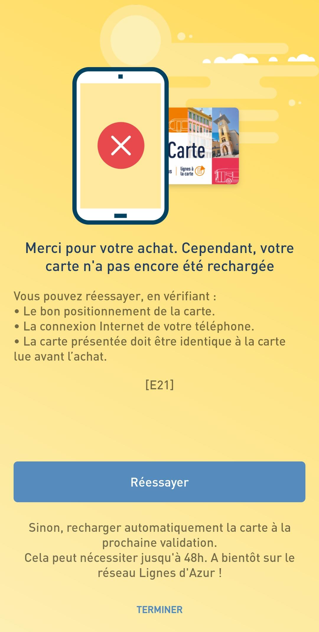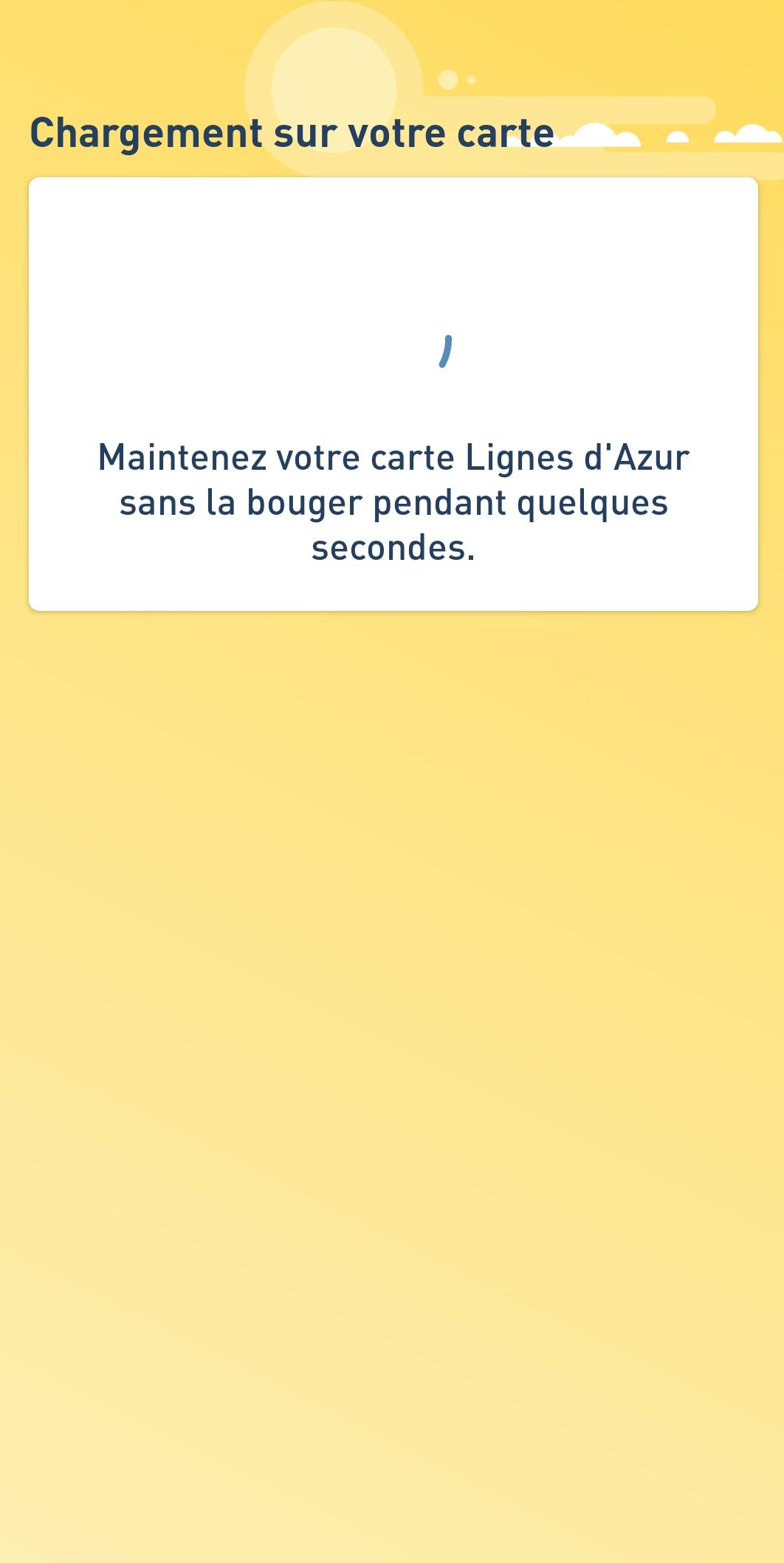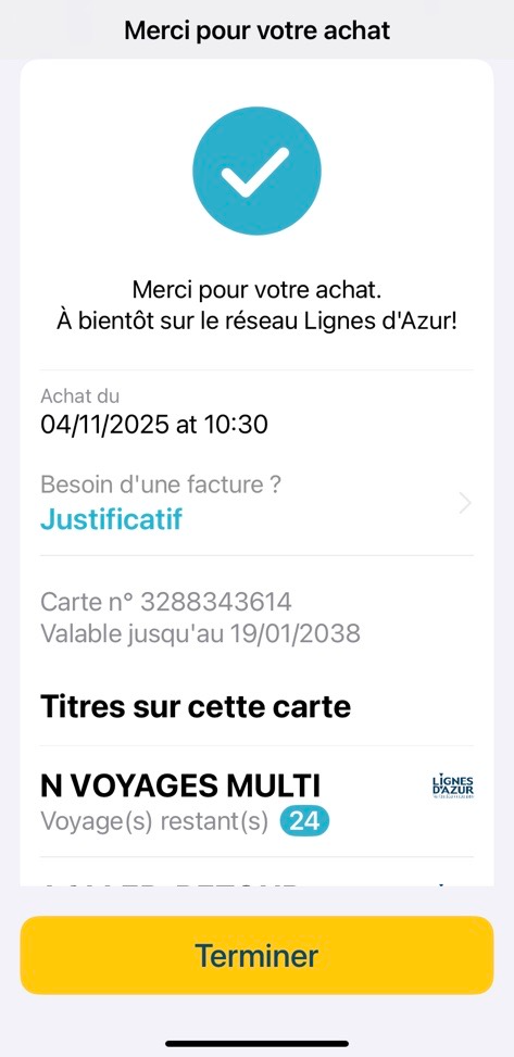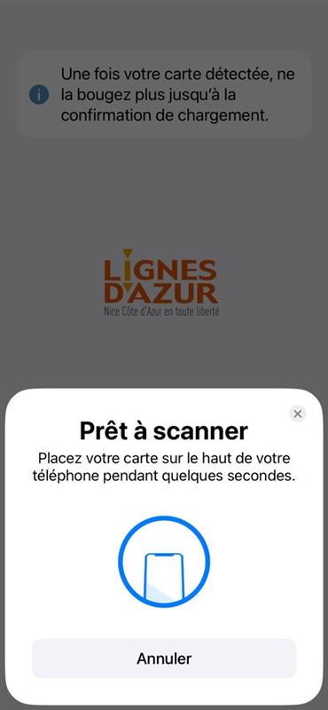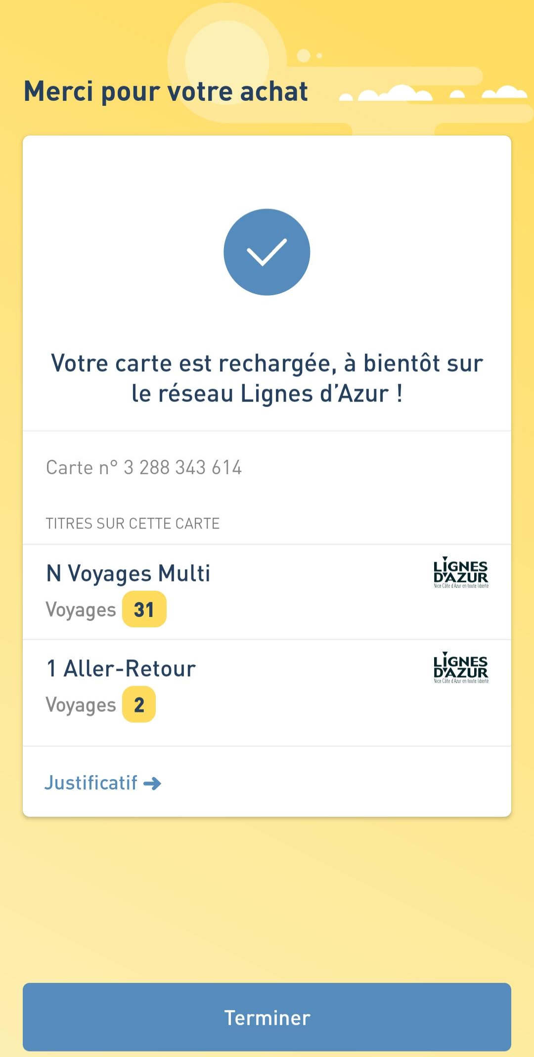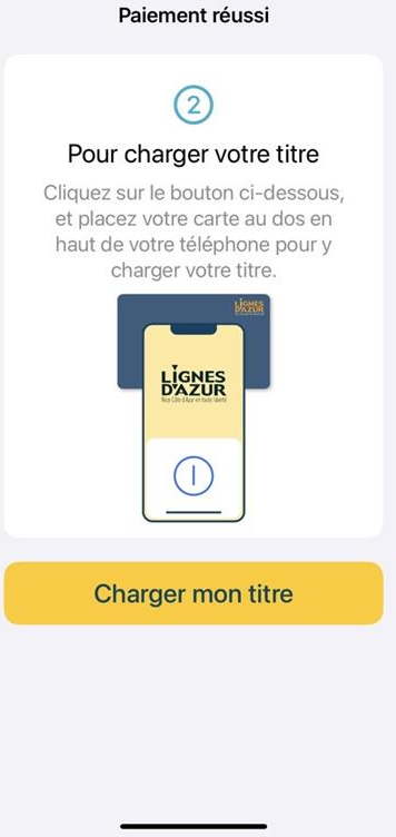 Dès que la carte est détectée, maintenez la parfaitement immobile, le titre se recharge et une page de confirmation s'affiche avec l'option de chargement de votre justificatif.